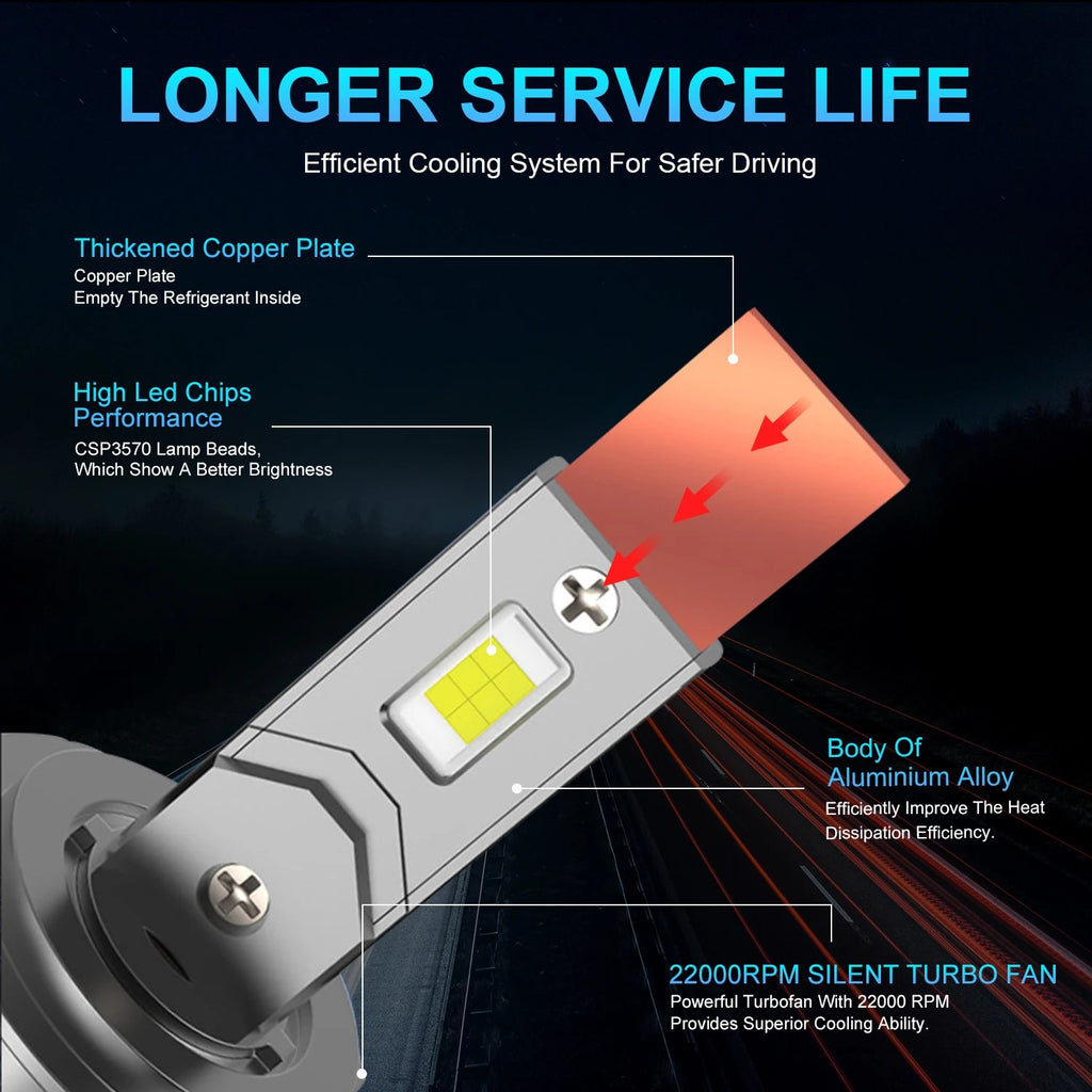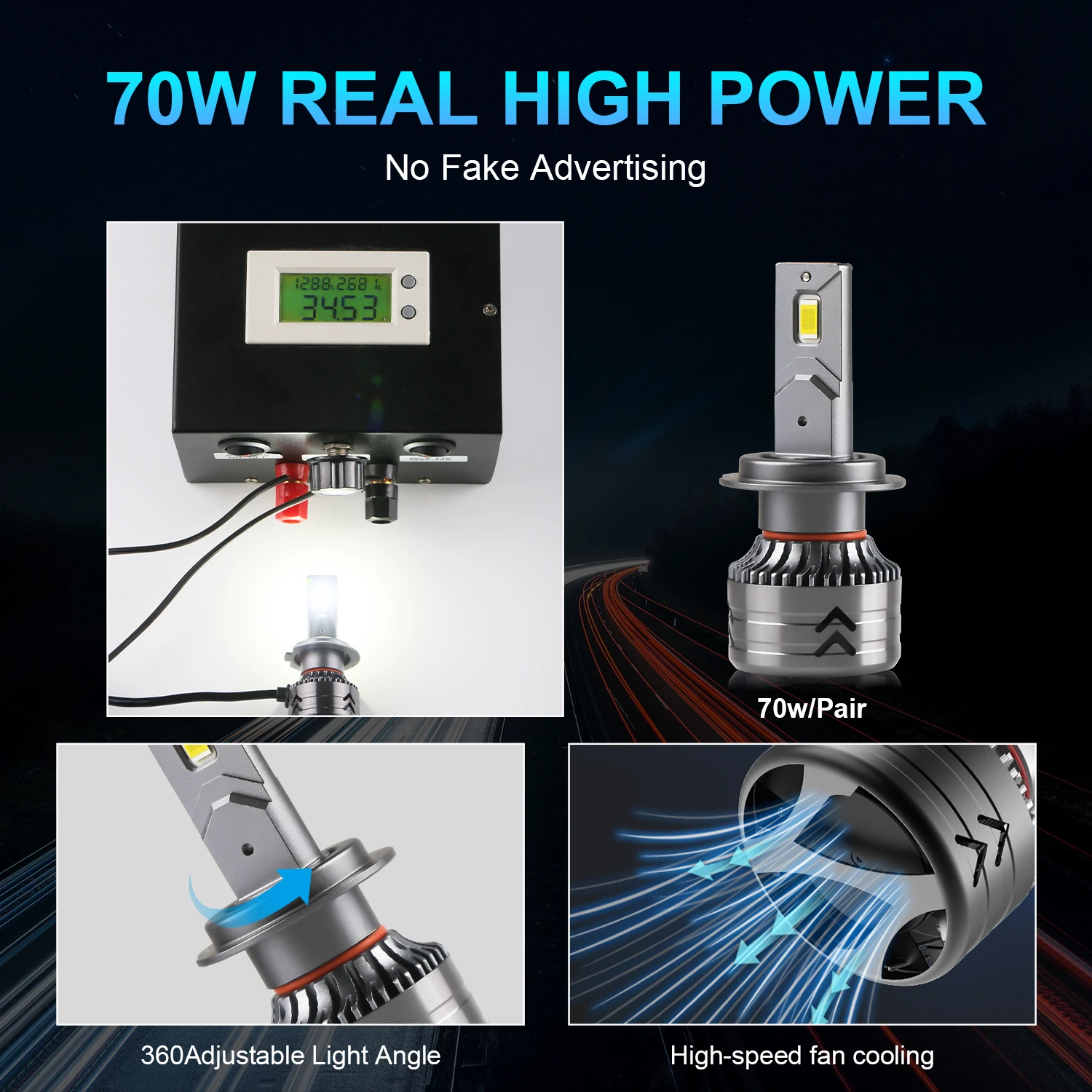 High Brightness - super bright headlight bulbs use Automotive Grade CSP LED chips with 70W, 22,000LM per pair, 6500K cool white, super focused beam pattern design provides wider and farther lighting range which 450% Brighter Than original halogen lamp.