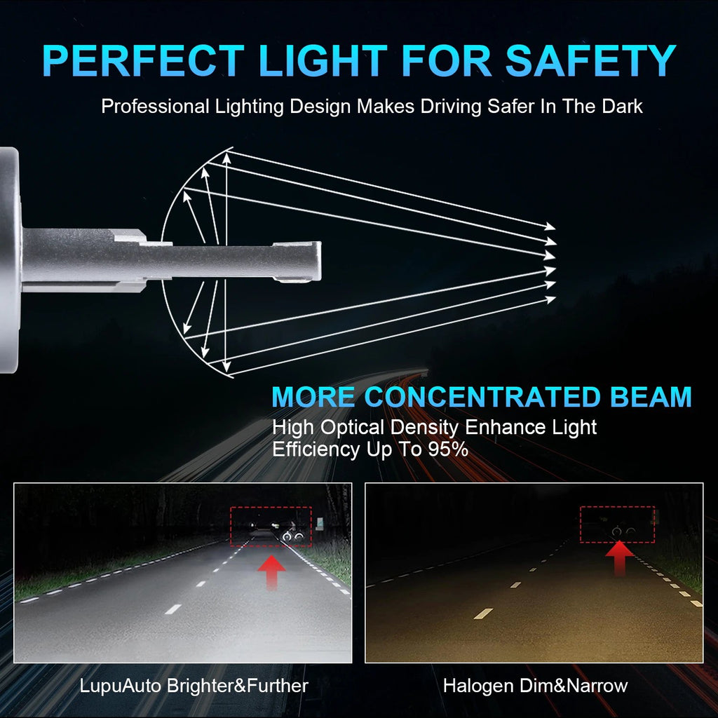 Decrease Accident Risk - Lupuauto led bulbs is 450% brighter than Halogen bulbs, 100% wider vision than other bulbs, focus beam pattern illuminates reveal road signs, without blinding other drivers.